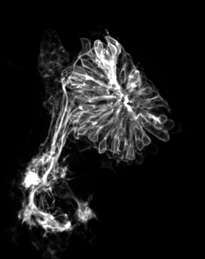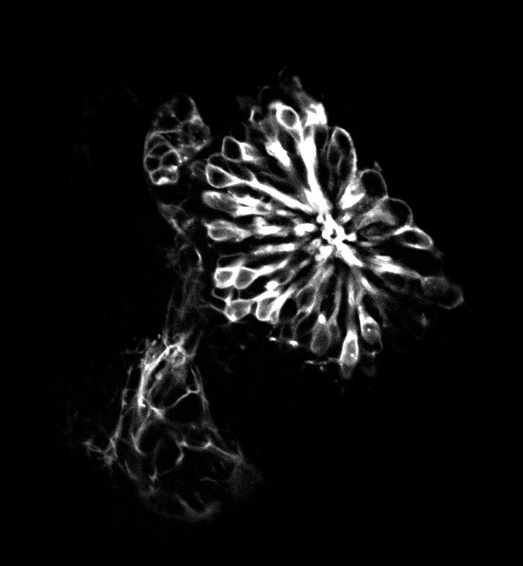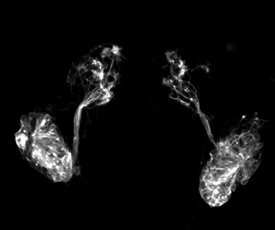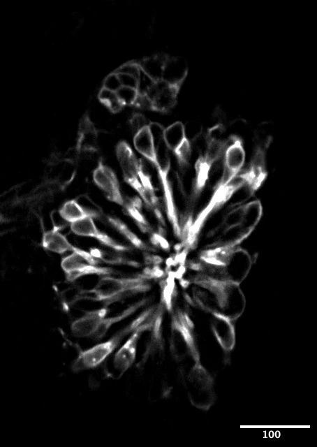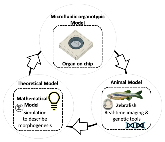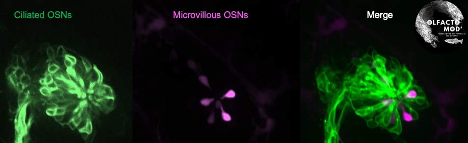 L’accessibilité et la relative simplicité de l’organe olfactif dans l’embryon de poisson zèbre en font un modèle de choix pour l’étude des processus de morphogenèse. Les précurseurs des placodes olfactives sont localisés dès 12 heures après la fécondation (hpf) au bord de la plaque neurale et forment un fer à cheval autour du cerveau antérieur ou télencéphale. Ensuite, un mouvement actif de convergence assemble la placode olfactive qui forme deux groupes sphériques de part et d’autre du télencéphale entre 18 et 21 hpf. Afin d’approfondir l’étude de ces mouvements cellulaires, nous souhaitons développer un modèle intermédiaire entre l’embryon et nos modèles mathématiques, permettant de recréer la morphogenèse de l’organe olfactif sur une puce imprimée en 3D, l’OlfactoChip. Ce projet s’appuie sur une collaboration avec le LAAS-CNRS. Le multiplexage de nos échantillons nous permettra d’utiliser une approche quantitative et qualitative à haut débit pour caractériser le comportement migratoire des cellules olfactives.