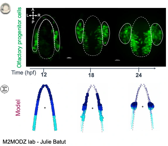 La modularité fait référence à un modèle de connectivité dans lequel les éléments sont regroupés en sous-ensembles, modules ou blocs de construction fortement connectés. Il s’agit d’une propriété importante en biologie, car elle permet à un système de « maintenir son état actuel » tout en permettant une évolution ultérieure. Les propriétés attribuées aux modules sont une organisation discrète définie par l’expression de gènes spécifiques et l’occupation de territoires physiques spécifiques. Chez les vertébrés, l’organisation fonctionnelle et architecturale du système olfactif est conservée tout au long de l’évolution. L’organe olfactif est composé de différents types de neurones sensoriels olfactifs, les OSN, chacun capable de détecter des molécules odorantes spécifiques, organisés avec une forme et une position, spécifiques, et exprimant chacun un ensemble de gènes spécifiques. Cependant, le comportement des cellules progénitrices n’a pas encore été caractérisé. Notre objectif est de décomposer la formation de l’organe sensoriel olfactif en modules : un module génétique et un module morphométrique et comportemental. Nous développons donc des approches multidisciplinaires qui utilisent une combinaison d’imagerie qualitative et quantitative sur l’embryon de poisson zèbre, de science des données, d’apprentissage automatique et d’analyse d’images et de modèles mathématiques pour identifier les deux modules et les assembler afin de générer un atlas transcriptomique unicellulaire dynamiquement lié aux comportements cellulaires et capable de prédire l’architecture d’un système biologique complexe : dans ce cas, l’organe sensoriel olfactif.