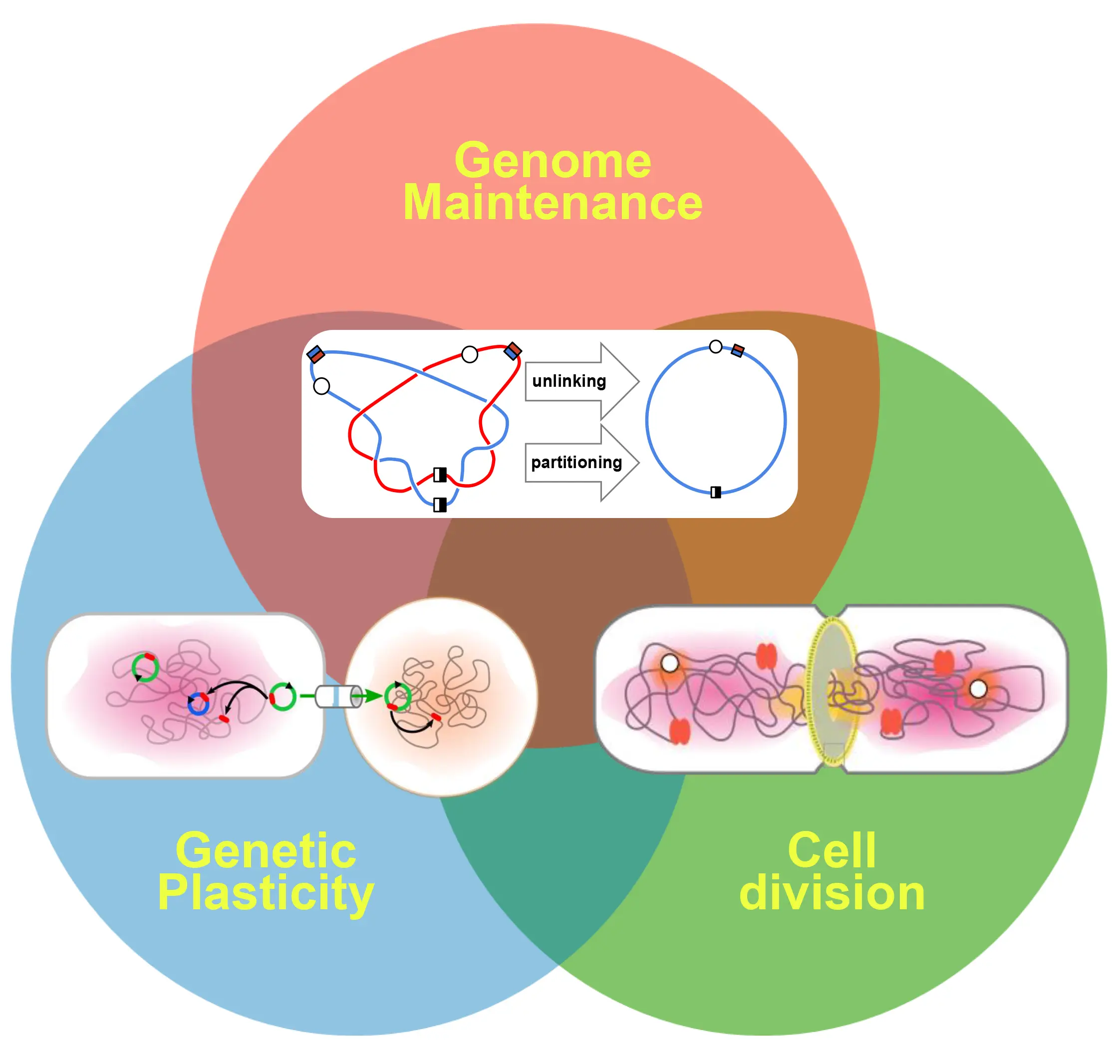 Notre équipe étudie les fonctions impliquées dans le maintien et la plasticité des différents réplicons composant les génomes bactériens, notamment les chromosomes et les plasmides. Nous nous concentrons sur les mécanismes moléculaires qui résolvent les liens physiques entre les réplicons frères et leur partition vers les cellules filles. En particulier, nous cherchons à comprendre comment ces mécanismes s’adaptent à diverses situations en fonction des types de réplicons et des espèces bactériennes, et comment cela permet la remarquable capacité d’adaptation des bactéries. Nos projets récents explorent les fonctions centrales des systèmes de partition de type ParABS, les mécanismes de résolution des chromosomes et plasmides entrelacés ou dimérisés et leur couplage avec la division cellulaire, ainsi que le rôle de la recombinaison site-spécifique dans la plasticité génomique et l’acquisition par les plasmides de gènes de résistance multiples aux drogues.
