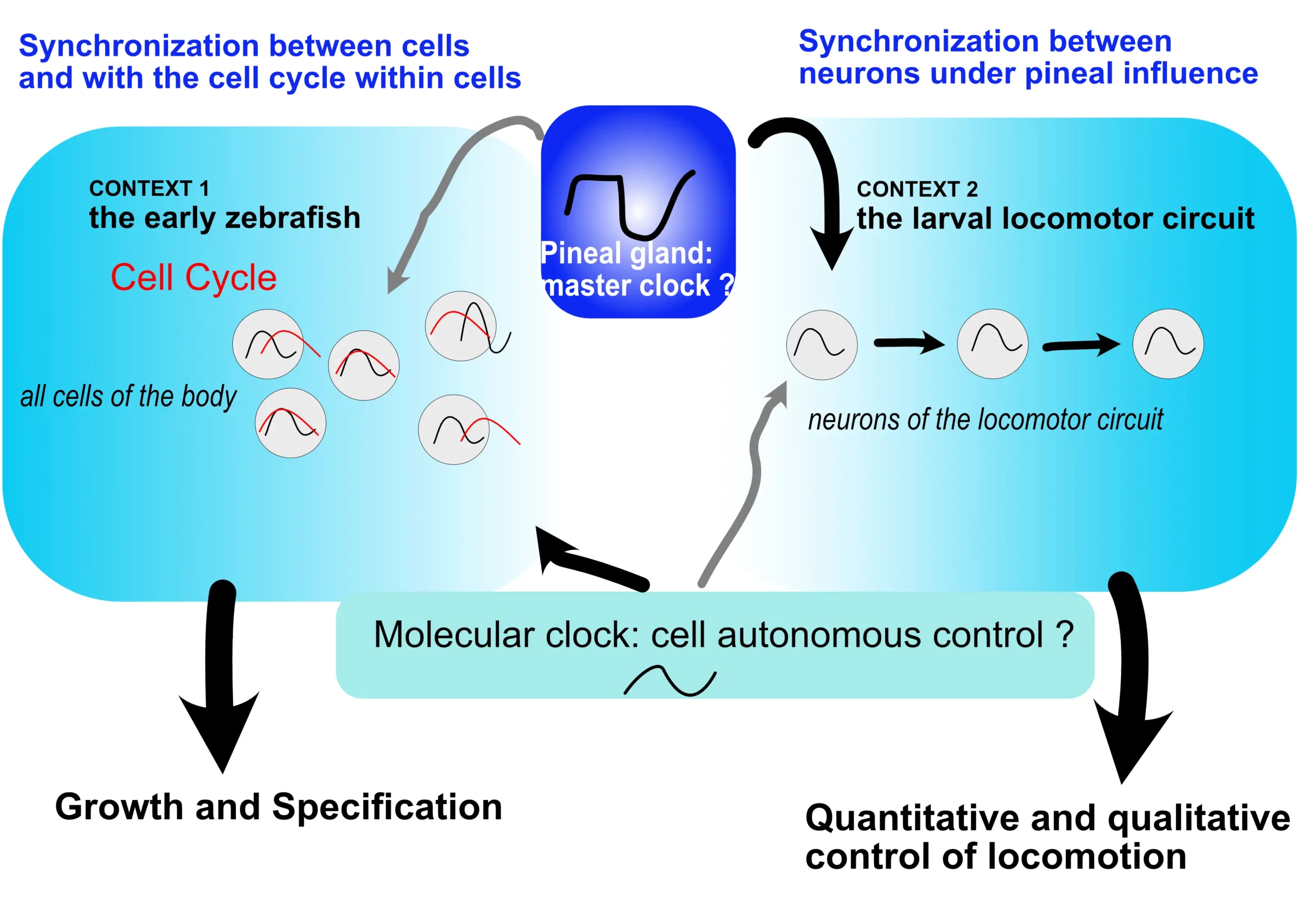 L’activité locomotrice cycle de manière quantitative durant la journée (avec plus d’activité le jour chez les espèces diurnes). Chez la larve de poisson zèbre, ce rythme est toujours présent en absence d’œil fonctionnel mais est perturbé lorsque l’on altère la fonction de l’horloge moléculaire dans des cellules particulières de la glande pinéale. Nous avons obtenu des résultats suggérant que la glande pinéale est connectée synaptiquement au circuit locomoteur.