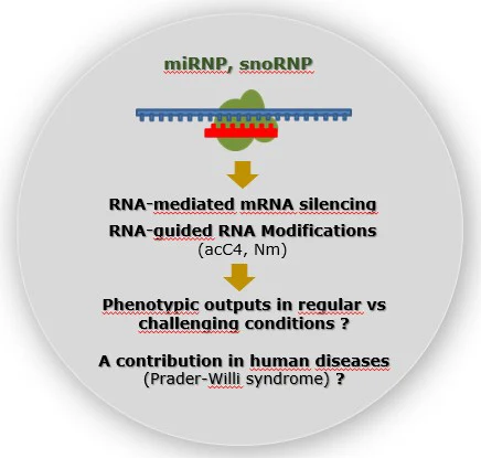 Notre équipe de recherche s’intéresse aux petits ARN non codants antisens, en se concentrant sur les petits ARN nucléolaires de la famille C/D (SNORD) et les microARN (miARN). Les SNORD et les miARN sont bien caractérisés en termes de structures, de partenaires protéiques et de modes d’action. En formant des appariements de base avec d’autres ARN cellulaires (ARNm, ARNr, ARNt et U-snARN), ils jouent un rôle important dans le contrôle post-transcriptionnel de l’expression des gènes : les SNORD guident la synthèse des méthylations en 2′-O-ribose et de la N4-acétylcitidine portées par les ARNr, U-snARN et ARNt tandis que les miARN inhibent la traduction et/ou favorisent la dégradation de leurs ARNm-cibles.