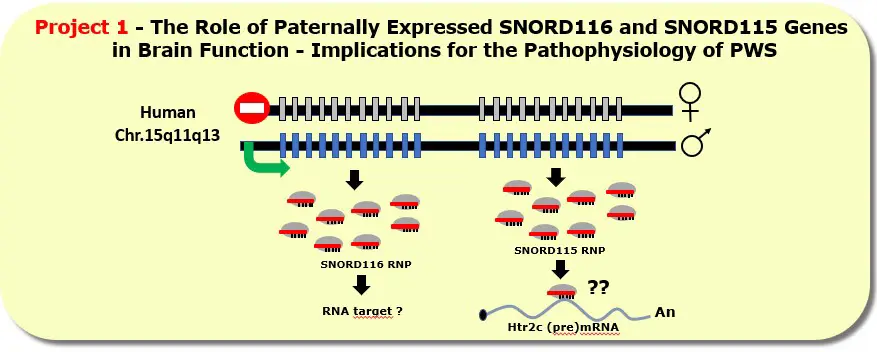 Le domaine chromatinien au locus 15q11q13 humain (synténique à la région 7c du chromosome murin) renferme de nombreux gènes de SNORD neuronaux exprimés de manière paternelle. La grande majorité de ces gènes sont regroupés en deux grandes régions répétées : SNORD116 et SNORD115. Contrairement aux autres SNORDs exprimés de manière ubiquitaire et bi-allélique, les cibles ARN cellulaires de SNORD116 et SNORD115 restent inconnues in vivo. SNORD115 est néanmoins prédit pour réguler la maturation du pré-ARNm htr2c (épissage alternatif et/ou édition A vers I). L’absence des SNORD, et en particulier celle des gènes SNORD116, est prédite pour jouer un rôle significatif dans la physiopathologie du Syndrome de Prader-Willi (SPW), une maladie génétique rare caractérisée par des anomalies hormonales et comportementales, avec notamment une hyperphagie comme symptôme marquant. Cet appétit incontrôlé peut conduire à une obésité sévère. Pour étudier les fonctions régulatrices médiées par ces SNORDs dans le cerveau, nous utilisons trois modèles de souris knockout : SNORD116-KO, SNORD115-KO et SNORD116/115-KO. Nous considérons qu’une meilleure compréhension de leur biologie pourrait non seulement révéler de nouveaux rôles régulateurs insoupçonnés dans les processus neuronaux, mais aussi fournir de nouvelles informations sur les mécanismes sous-jacents du SPW et ainsi aider à identifier des cibles thérapeutiques pour gérer ses symptômes.
