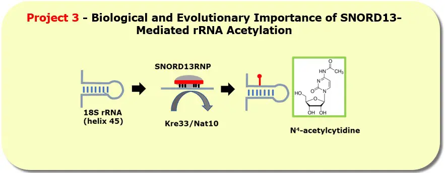 La N4-acétylcitidine (ac4C) hautement conservée présente dans l’hélice 45 de l’ARNr 18S est dirigée par SNORD13 (U13). SNORD13 établit deux appariements de bases imparfaits à proximité de la cytidine à modifier, ce qui facilite probablement le recrutement de la N-acétyltransférase NAT10 qui catalyse l’acétylation de la cytidine par des mécanismes qui demeurent encore très mal compris. De manière surprenante, l’acétylation de l’hélice 45 n’apparait pas essentielle pour la croissance des cellules humaines, la biogenèse des ribosomes, la traduction et le développement du poisson zèbre. Nos recherches en cours visent à élucider comment SNORD13 cible spécifiquement l’hélice 45 et à explorer le rôle de la N4-acétylcitidine dans la structure et fonction des ribosomes, notamment dans des conditions de stress physiologiques.