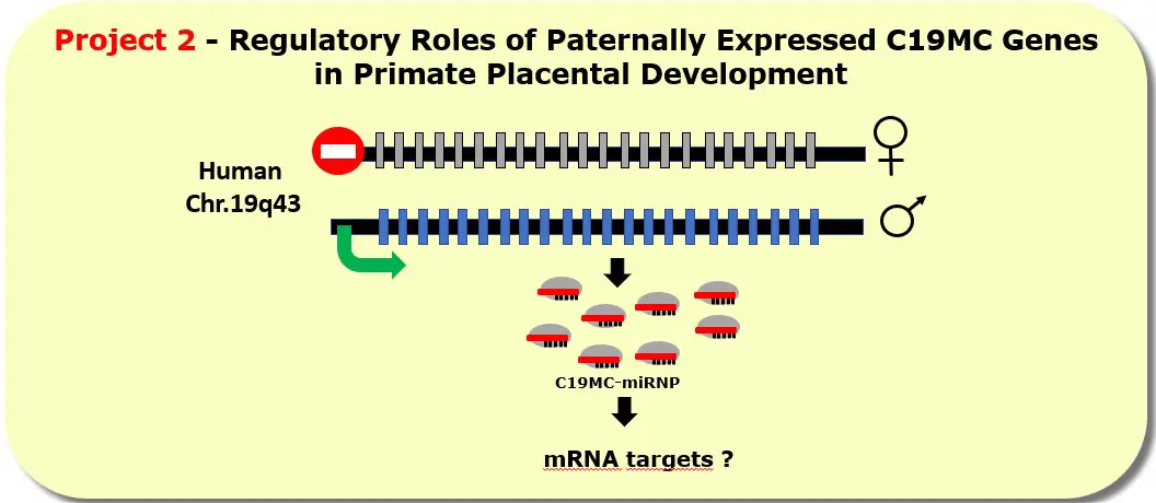 Le cluster de microARN du chromosome 19 (C19MC) constitue une innovation génétique récente, présente exclusivement chez les primates. Ce cluster comprend une région noncodante d’environ 100 kb portant des gènes de miARN répétés en tandem (n = 46), exprimés de manière paternelle, et ce, exclusivement dans le placenta où ils représentant 20-30 % de la population totale de miARN dans ce tissu. Afin de mieux comprendre la fonction de C19MC, nous développons maintenant une série d’approches moléculaires et cellulaires vidant à identifier le répertoire complet des ARNm ciblés par C19MC-miRNA. Cette recherche ouvre de nouvelles perspectives pour explorer comment l’émergence récente de régulations via les miRNA influencent le développement et les fonctions du placenta chez les primates.