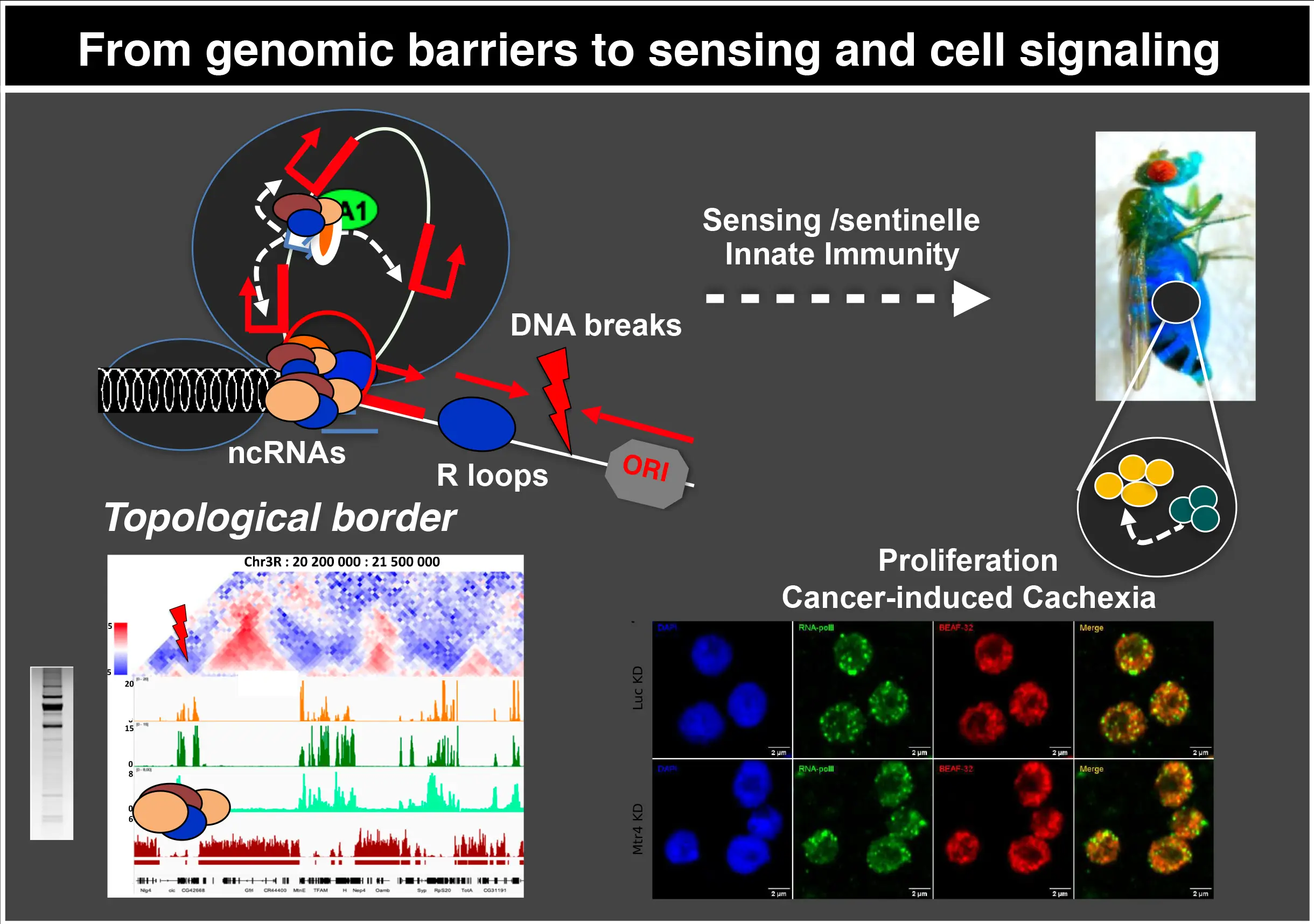 Chez la drosophile, nous étudions ces voies pour caractériser la détection endogène de l’ARN-ADN en cas de stress oncogène, de défauts de pause, ou lors de la production non contrôlée d’ARNnc et de boucles R, dans le contexte des hélicases ARN identifiées dans notre équipe, qui servent par ailleurs à traiter l’ADN viral. Nous caractérisons l’impact de leurs dysfonctionnements sur les cellules souches adultes en transformation, afin de mieux comprendre comment la voie de l’immunité innée protège le génome dans un tel contexte.