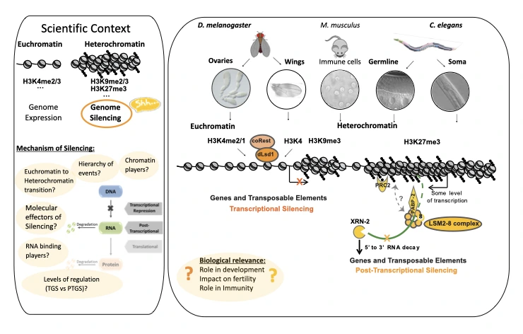 Dans l’équipe, nous nous intéressons aux mécanismes épigénétiques transcriptionnels et post-transcriptionnels sous-jacents à la répression du génome. Ces deux niveaux sont régulés par de nombreux processus, notamment par l’activité de facteurs de transcription, de protéines de liaison à l’ARN et d’enzymes modifiant la chromatine. La chromatine est composée d’ADN et de protéines dont les histones qui peuvent être modifiées. Les modifications des histones confèrent une couche supplémentaire de régulation qui affine l’expression aux niveaux transcriptionnel et post-transcriptionnel. Nos organismes modèles préférés sont la mouche Drosophila et le vers C. elegans, mais nous travaillons également sur des cellules mammifères, y compris des cellules humaines et murines primaires lorsque cela est nécessaire. Utilisant une combinaison d’analyses microscopiques, biochimiques, moléculaires, génétiques et génomiques, nos principaux intérêts de recherche se concentrent sur la: