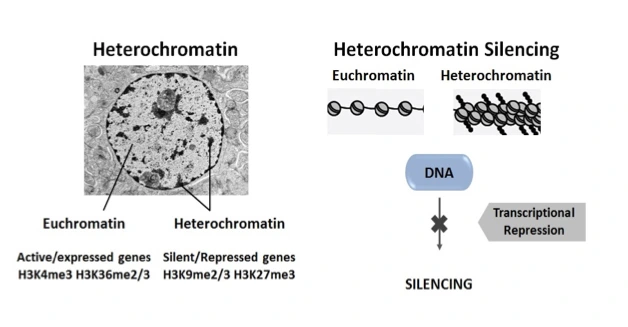 Toutes les cellules de notre corps possèdent le même génome et donc les mêmes gènes (ADN). C’est l’expression de combinaisons différentes de ces gènes qui contribue à créer des types de cellules différentes et à s’adapter à l’environnement. La régulation de l’expression des gènes, c’est-à-dire de l’ADN en ARN puis en protéines, est donc essentielle à la vie. L’ADN est plus ou moins condensé au sein des cellules. Plus cet ADN est condensé, appelé alors hétérochromatine, plus l’expression de certains gènes est inhibée (régulation négative ou répression) en fonction du type de cellules.