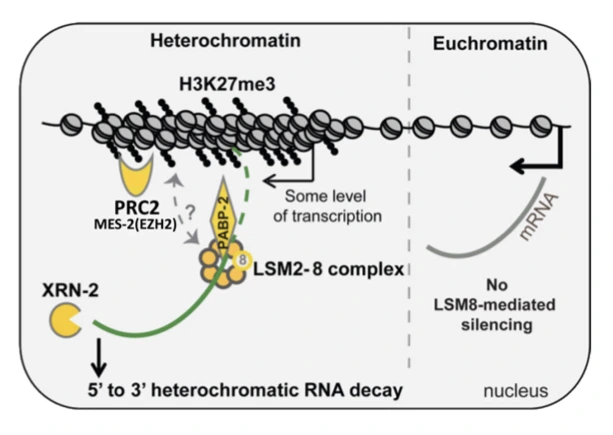 LSM2-8 and XRN-2 contribute to the silencing of H3K27me3-marked genes through targeted RNA decay.