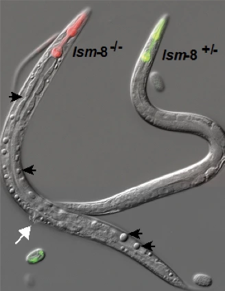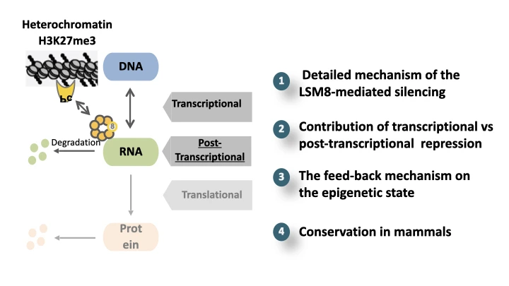 Jusqu’à présent, la répression de l’hétérochromatine était expliquée par une régulation au niveau transcriptionnel c’est-à-dire au niveau de la transformation de l’ADN en ARN. Notre récente découverte montre pour la première fois chez les animaux (C. elegans) qu’il existe un autre niveau de régulation, post-transcriptionel, qui dégrade spécifiquement l’ARN provenant de l’hétérochromatine. Nous avons montré qu’un complexe nucléaire « LSM2-8 » peut identifier spécifiquement des molécules d’ARN provenant de régions de l’hétérochromatine (enrichi en H3K27me3) qui sont ensuite dégradés dans le noyau de la cellule par une enzyme, l’exoribonuclease XRN-2. Cette recherche permettra, outre une meilleure compréhension en général de la régulation post-transcriptionelle, d’ouvrir des pistes thérapeutiques sous un angle novateur dans différentes pathologies.