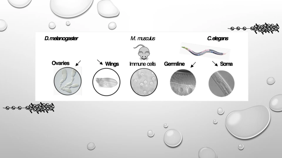 Le contrôle fin de la transcription des gènes nécessite une régulation dynamique de la structure de la chromatine, et le rôle précis des marques d’histones dans ce processus est un sujet d’étude intense. En particulier, on sait peu de choses sur le rôle des marques chromatiniennes dans la régulation des éléments transposables (ET). Les ETs sont des composantes majeures des génomes, comprenant environ 20% du génome de la drosophile et jusqu’à 50% chez l’humain. Les ETs sont des éléments génétiques qui menacent la stabilité génomique par leur capacité à se déplacer dans le génome. Une régulation stricte de l’expression des ETs semble essentielle pour le développement normal mais aussi pour la physiologie normale des tissus somatiques adultes puisque leur régulation aberrante est liée à l’infertilité, au cancer et aux maladies neurodégénératives. Comprendre comment les éléments transposables sont régulés au sein du génome est donc une question fondamentale en biologie. Bien que l’on sache que l’hétérochromatine est impliquée dans la répression des ETs, les aspects mécanistiques de cette régulation n’ont pas été complètement établis et une série de questions restent sans réponse.