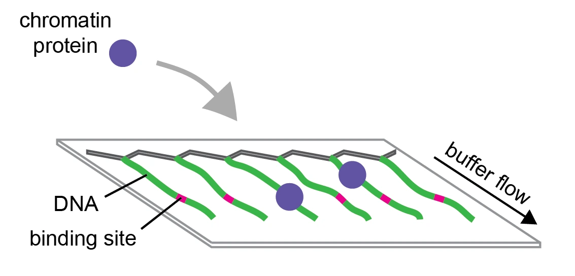 Nous utilisons des techniques de molécule unique notamment les « DNA curtains » pour étudier le comportement dynamique des molécules d’ADN et de leurs partenaires d’interaction en temps réel. Les « DNA curtains » nous permettent de visualiser et quantifier directement la liaison des protéines à l’ADN et le transport des protéines le long de l’ADN. Nous pouvons également suivre les changements de conformation de l’ADN et les mécanismes de l’assemblage de complexes nucleoprotéiques. Sur la base de ces données, nous cherchons à comprendre comment différentes protéines déterminent la répartition du génome en types de chromatine fonctionnellement distincts et sa perturbation en cas de maladie.