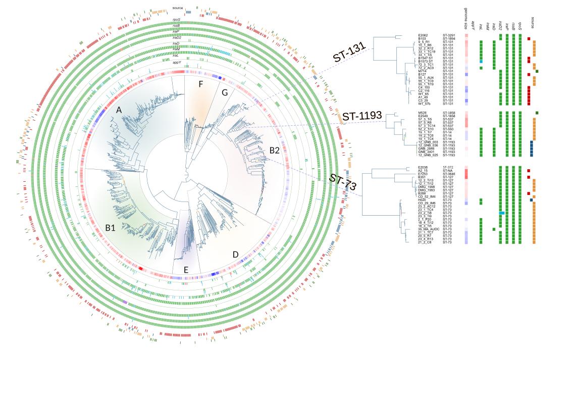 La quantité de RpoS étant contrôlée au niveau post-traductionnel par des protéines anti-adaptatrices qui le protègent de la protéolyse, nous étudierons de manière exhaustive la famille Ira de protéines anti-adaptatrices stabilisant RpoS et évaluerons les conséquences de ces stabilisations sur l’aptitude et l’adaptation bactériennes. Nous sommes en charge d’un workpackage dont l’objectif est de réaliser des analyses phylogénomiques globales des gènes Ira au sein de l’espèce E. coli, de mettre en évidence leur diversité de composition, de distribution et de régulation, de définir leurs liens avec le phénotype et/ou le background génétique des souches et d ‘inférer leur trajectoire évolutive. Nous avons réalisé une première étude phylogénétique en utilisant une collection d’intérêt épidémiologique détenue par Erick Denamur, composée de 1244 souches représentatives de la diversité d’E. coli en Australie. Cette analyse préliminaire a révélé que le phylogroupe B2 a un contenu ira particulier.