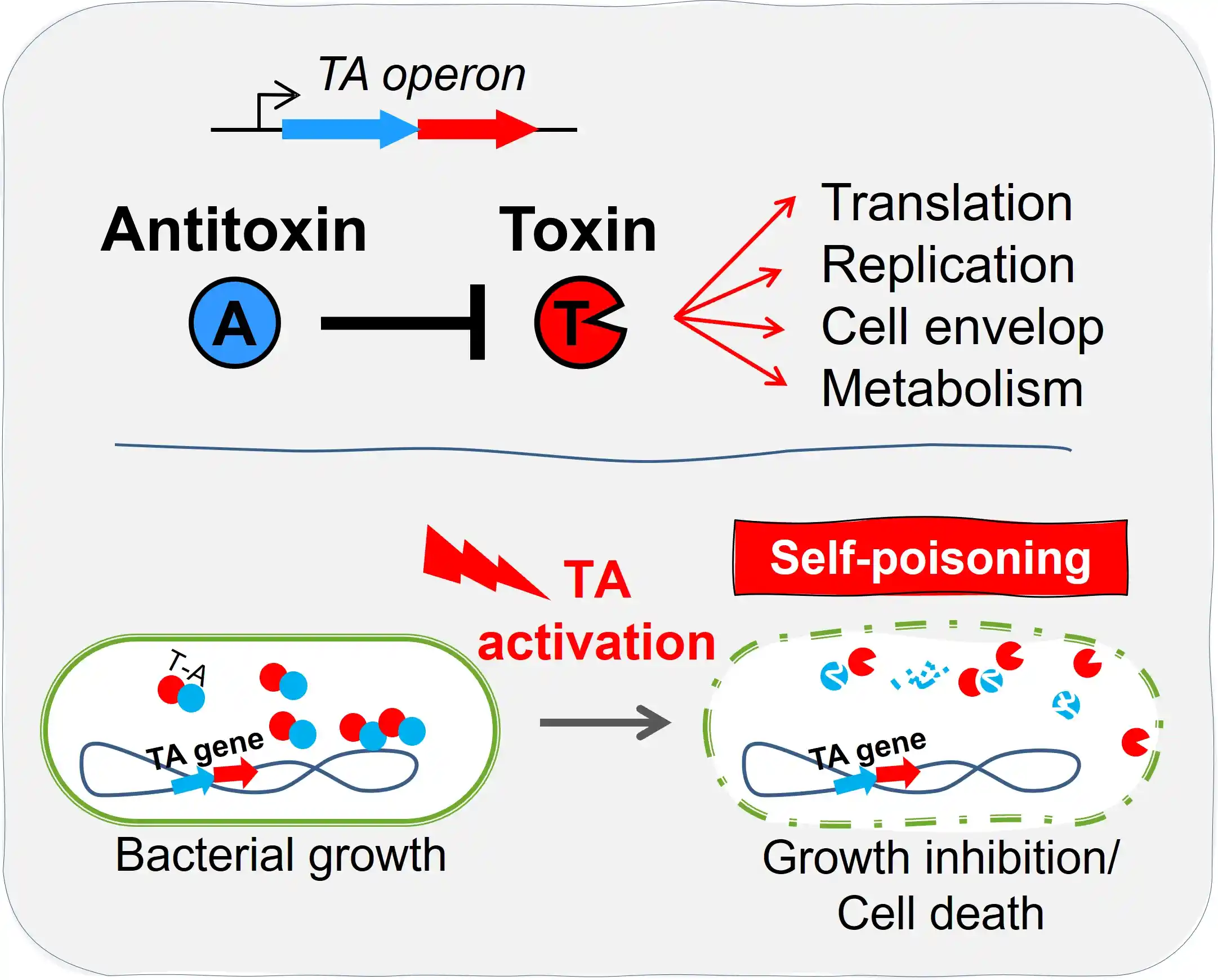 Les systèmes toxine-antitoxine (TA) sont de petits éléments génétiques codant pour une toxine délétère et son antitoxine. Ils sont très répandus dans les génomes des bactéries et des archées, ainsi que dans les éléments génétiques mobiles. Ils font partie du système immunitaire bactérien et jouent un rôle dans la défense des bactéries contre l’infection par les phages, dans la maintenance des régions génomiques ou des plasmides et, dans certains cas, dans la virulence bactérienne et la persistance des antibiotiques. En outre, la nature hautement toxique de certaines toxines des systèmes TA a soulevé la possibilité que de nouvelles propriétés antibactériennes portées par les toxines puissent être utilisées pour identifier de nouvelles cibles médicamenteuses ou directement comme antimicrobiens auto-empoisonnés, seuls ou en combinaison avec l’antibiothérapie standard.