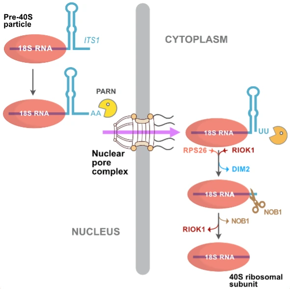 Les ARN ribosomiques structurent les sous-unités ribosomiques et constituent l’essentiel de leur masse. Trois des quatre ARN ribosomiques (ARNr) sont synthétisés sous forme d’un précurseur commun codé par l’ADN ribosomique. La maturation de ce précurseur permet de faire émerger progressivement les ARNr matures en éliminant les séquences qui les encadrent, appelées espaceurs transcrits. Ces étapes de maturation sont coordonnées avec le repliement de l’ARN et l’assemblage des protéines ribosomiques sous le contrôle d’un grand nombre de facteurs de biogenèse des ribosomes. La majeure partie de la biogenèse des ribosomes a lieu dans le noyau, et plus particulièrement dans le nucléole, mais la maturation des particules pré-ribosomiques n’est achevée qu’après l’exportation vers le cytoplasme.