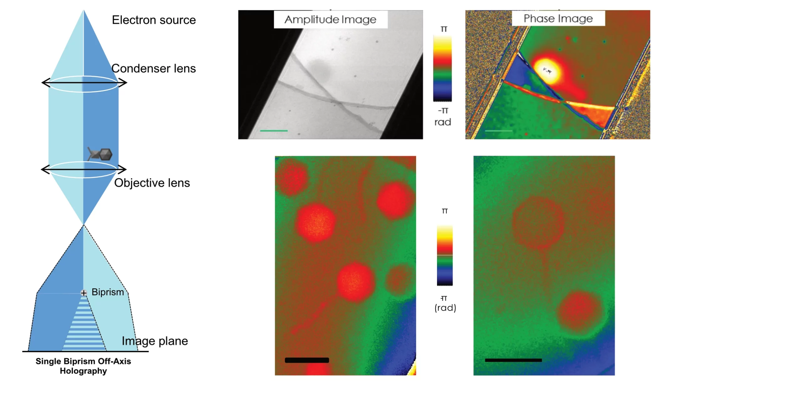 Notre équipe est depuis longtemps impliquée dans la mise en œuvre de nouvelles techniques de microscopie électronique, notamment la tomographie électronique, la microscopie corrélative et la cryo-EM, en lien avec le plateau de microscopie électronique du CBI (METi). Nous avons récemment développé un projet de recherche interdisciplinaire avec Etienne Snoeck au CEMES à Toulouse, un laboratoire du CNRS spécialisé en science des matériaux. Ce laboratoire a développé un microscope électronique unique de 300 keV pour faire de l’holographie électronique, une technique spectroscopique permettant l’enregistrement d’images de phase et la détection de potentiels électrostatiques dans des échantillons à des échelles nanométriques. Nous avons combiné notre expertise pour explorer le potentiel de cet instrument à imager des échantillons biologiques à température ambiante ou en mode cryogénique sans aucune coloration. Des images de phages T4 et T5 ont été obtenues en mode hors axe ou en ligne, révélant des capacités prometteuses dans la mesure de potentiels électrostatiques locaux, et permettant d’identifier un certain nombre de problématiques qui devront être résolues à l’avenir pour l’utilisation de cette technique sur des objets biologiques. (Thèse de doctorat d’Elio Karim ; Karim et al., J. Struct. Biol. 2025 ; collaboration : METi)