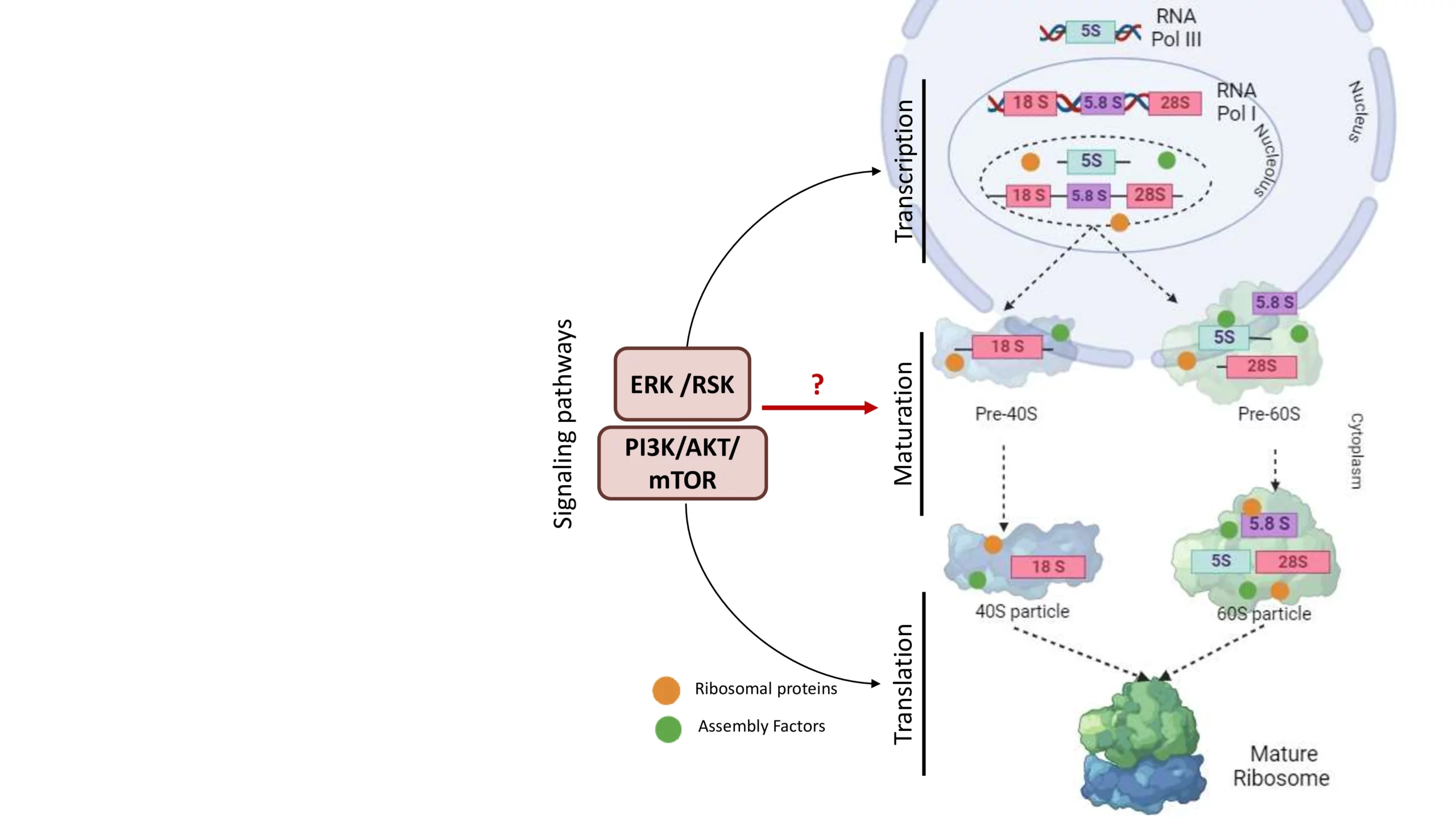 Un grand nombre de facteurs d’assemblage des ribosomes (FA) jouent un rôle central dans l’assemblage et la maturation des particules précurseurs. Ces étapes d’assemblage et de maturation comprennent le repliement progressif des ARNr et l’incorporation des protéines ribosomiques pour donner les sous-unités ribosomiques matures.