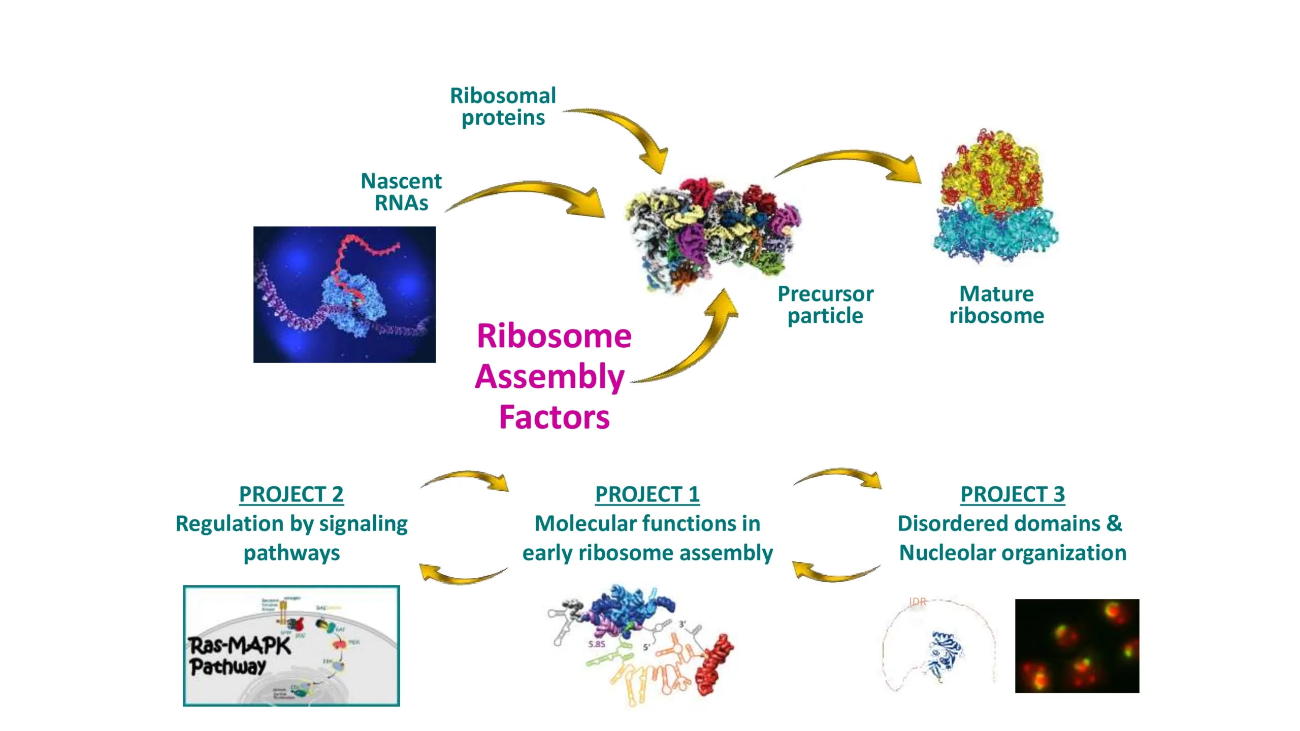 Nos recherches visent à comprendre comment les ribosomes sont assemblés dans les cellules eucaryotes à partir des ARN ribosomiques (ARNr) naissants transcrits par les ARN polymérases I and III (ARN Pol I and III) et les protéines ribosomiques (PR).