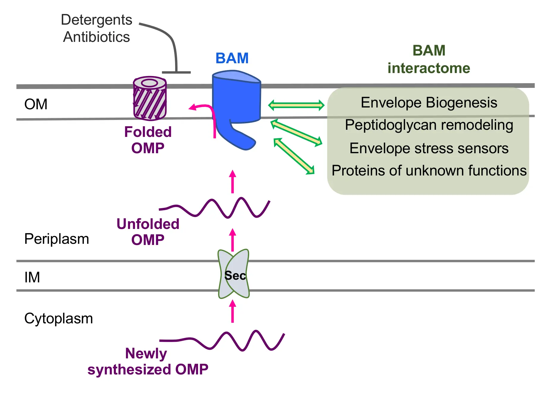 L’un des principaux objectifs de notre laboratoire est d’élucider les mécanismes cellulaires qui coordonnent la biogenèse efficace de la ME et la manière dont la ME subit des remaniements majeurs, par exemple au cours de la division cellulaire, tout en préservant son intégrité. À cette fin, nous étudions comment la machinerie « BAM », processus essentiel d’assemblage des OMPs dans la ME, est coordonnée avec d’autres processus de biogenèse et de remodelage de l’enveloppe bactérienne. Nous avons établi une approche interactomique quantitative qui met en évidence un réseau dense d’interactions du complexe « BAM » avec d’autres machineries d’assemblage membranaire, différents types de capteurs de stress de l’enveloppe et de nombreuses protéines non caractérisées. Ce dernier groupe comprend deux protéines que nous avons récemment étudiées : DolP, un facteur d’assemblage de BamA, et LptM, un nouveau composant du translocon des lipopolysaccharides (Ranava et al., 2021 ; Yang et al 2023, Chen et al., en préparation). Nos projets actuels et futurs explorent le fonctionnement des co-facteurs de « BAM » au niveau moléculaire.