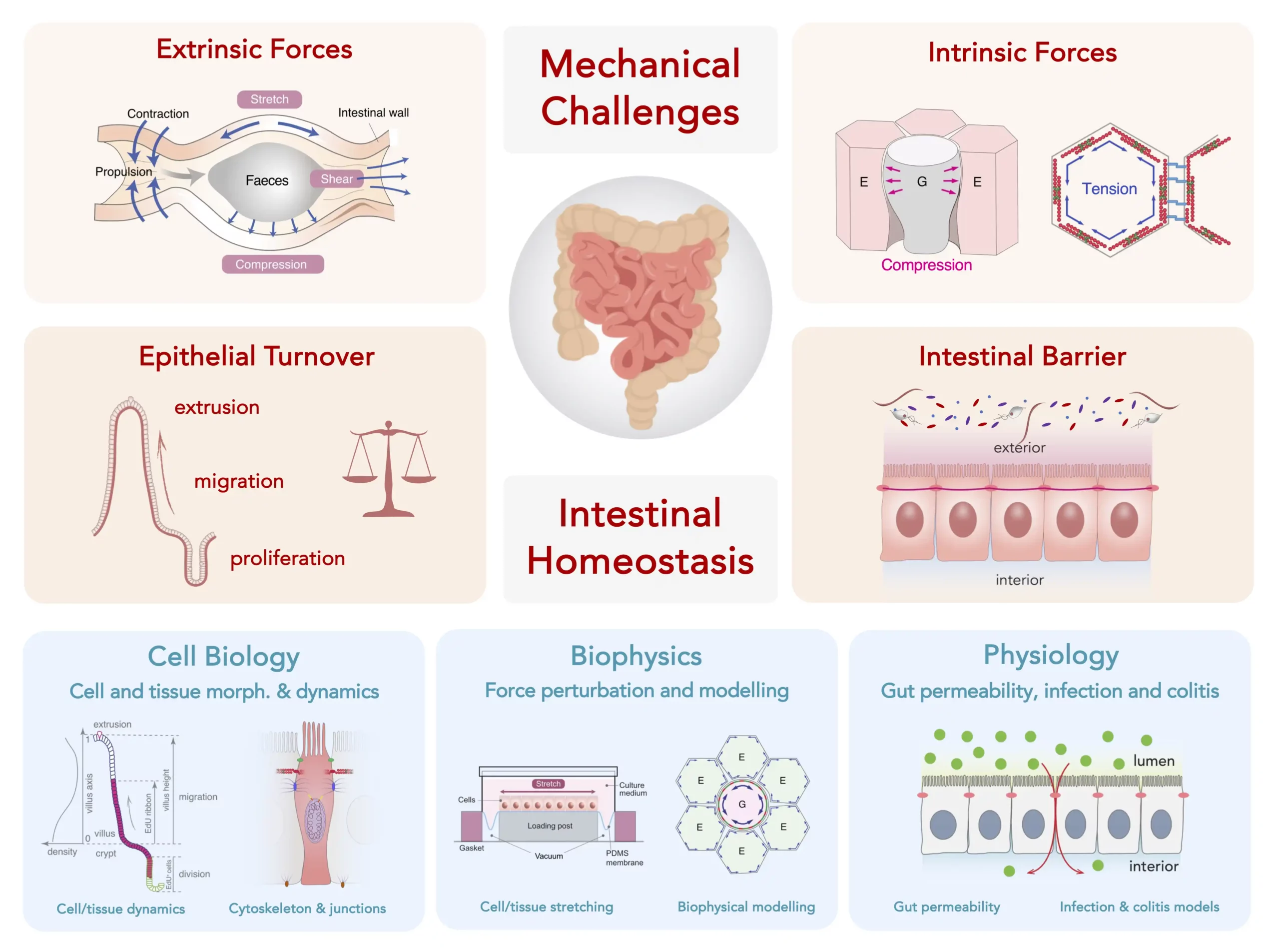 Le renouvellement épithélial en état stable dans l’intestin adulte assure un apport constant de cellules métaboliquement adaptées tout en préservant la taille constante du tissu et l’intégrité de la barrière épithéliale intestinale. Le renouvellement de l’épithélium intestinal repose sur des processus coordonnés de prolifération, de différenciation, de migration et de perte cellulaires. Les bases mécaniques de ces processus restent en grande partie floues, notamment la manière dont ils sont coordonnés pour maintenir la taille constante du tissu ainsi que l’intégrité du tissu face aux nombreuses contraintes mécaniques auxquelles l’épithélium intestinal est soumis.