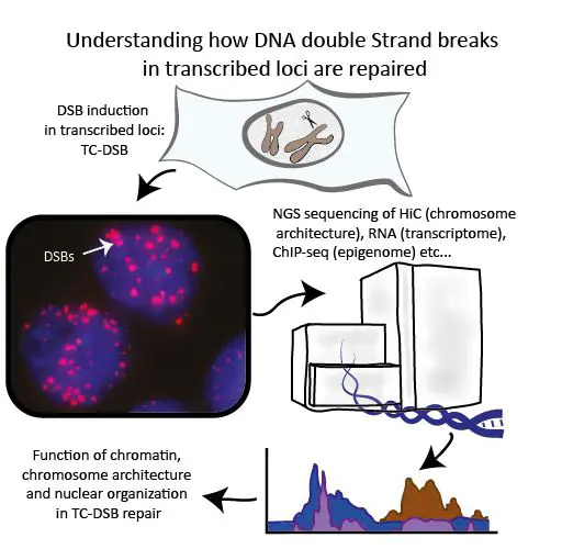 Les cassures doubles brins de l’ADN sont des lésions très toxiques qui peuvent conduire à l’apparition de réarrangements conséquents sur le génome, pouvant conduire à l ‘apparition des cancers. Au sein de l’équipe, nous cherchons à comprendre comment les cassures double-brin de l’ADN sont réparées dans le contexte de la chromatine, de l’architecture des chromosomes et de l’organisation nucléaire. Pour répondre à ces questions, nous utilisons des technologies basées sur le séquençage à haut débit couplées à une lignée cellulaire humaine (les cellules DIvA) qui permet d’induire de multiples cassures double brin à des positions annotées, de manière contrôlée.