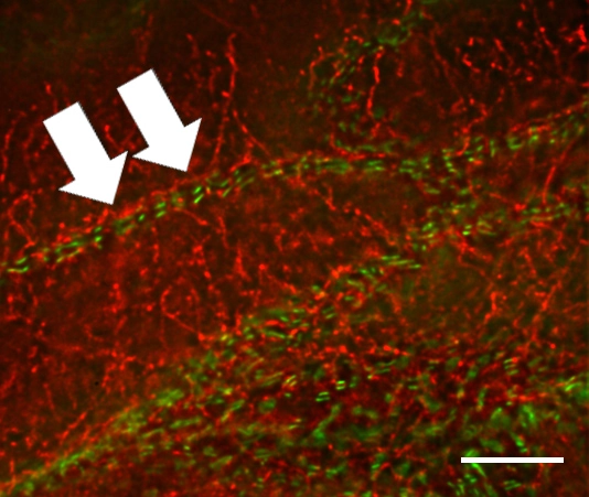 Dans les kératinocytes épidermiques, l’organisation des microtubules centrosomales est perdue et un sous-ensemble de microtubules est réorganisé au niveau du cortex cellulaire (flèches). Une section de peau de souris est visualisée après microscopie à expansion. Rouge : microtubules, vert : desmosomes. Barre, 2,5 μm.