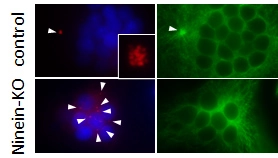 Les ostéoclastes sont des syncytia qui se forment par fusion de cellules précurseurs. Les centrosomes (pointes de flèches) sont regroupés en petites zones, mais ce regroupement est perdu dans les ostéoclastes des souris knock-out pour le gène Ninein, ce qui conduit à un réseau de microtubules non focalisé. Les souris knock-out pour le gène Ninein présentent une ossification prématurée au début du développement. Rouge : centrosomes, bleu : noyaux, vert : microtubules. Barre, 10 μm.
