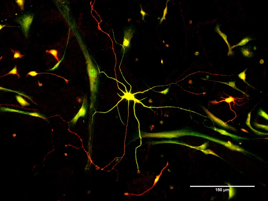 Neurone humain induit par conversion directe de fibroblastes au 35ème jour de culture.