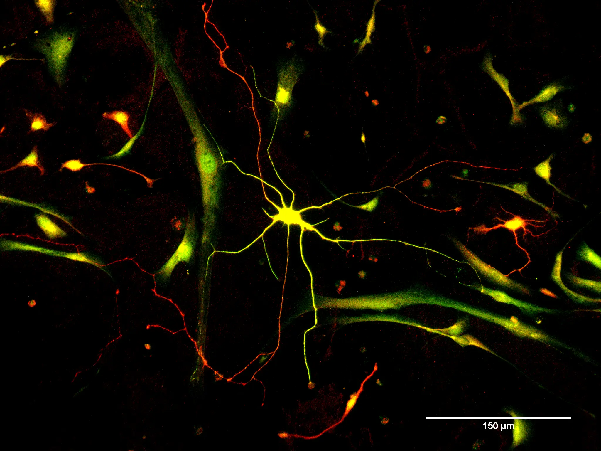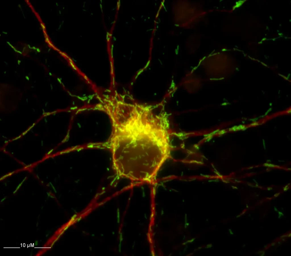 Neurone dérivé de cortex embryonnaire de rat après 6 jours de culture. Détection en immunofluorescence du marqueur neuronal MAP2 (en rouge) et des mitochondries (en vert et jaune).
