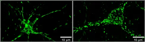 Détection par immunofluorescence des marqueurs neuronaux MAP2 (vert) et Tau (rouge).