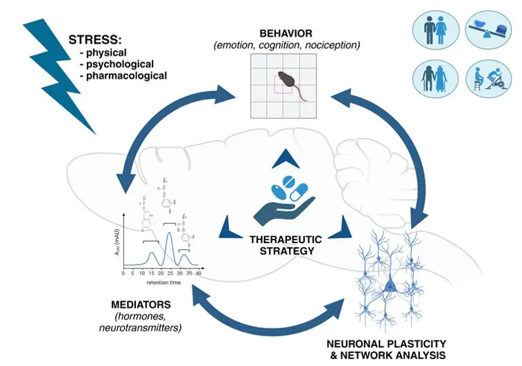 La réponse au stress aigu est une réaction physiologique qui prépare les individus à faire face à des événements nuisibles, voire traumatisants. Cette réaction s’accompagne d’une constellation de comportements réflexes de survie et de réponses neuronales qui peuvent, dans certaines circonstances, être déréglées. Une dérégulation prolongée peut entraîner une altération fonctionnelle conduisant à des troubles liés au stress tels que l’état de stress post-traumatique (TSPT), la dépression majeure (DM) ou l’une des nombreuses pathologies anxieuses (souvent comorbides). Les traitements actuellement disponibles pour ces troubles neuropsychiatriques sont, pour la plupart, des inhibiteurs de recapture des monoamines, en particulier les inhibiteurs de recapture de la sérotonine (5-HT) et/ou de la noradrénaline (NE). Malgré leur efficacité, ces composés pharmacologiques présentent d’importantes limites, notamment un long délai d’action et des effets secondaires indésirables.