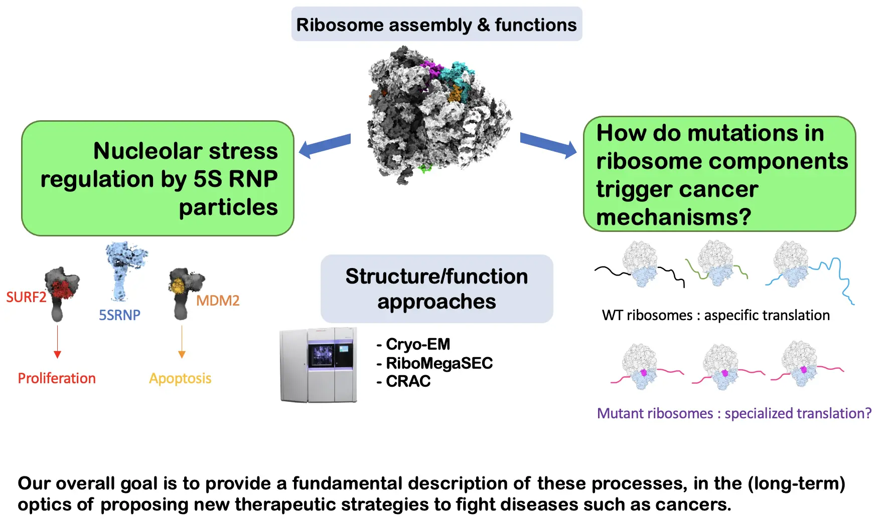 Les ribosomes sont des machines moléculaires universelles, qui traduisent l’ARNm en protéines. Au travers de leur fonction (la traduction), mais aussi grâce à leurs processus d’assemblage, les ribosomes se trouvent au coeur de la régulation des gènes, et ainsi de la destinée et de l’homéostasie cellulaires. Nous développons une approche intégrée, combinant des méthodologies structurales et fonctionnelles, pour caractériser les liens entre les ribosomes et le destin cellulaire dans des conditions normales et pathologiques, en particulier au cours des mécanismes du cancer. Notre objectif global est de fournir une description fondamentale de ces processus oncogéniques, dans l’optique de développer de nouveaux marqueurs pronostiques ou des stratégies thérapeutiques pour des types de cancer particuliers