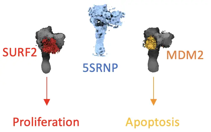 Afin de maintenir une capacité de prolifération élevée, la plupart des cellules cancéreuses sont dépendantes d’un niveau élevé de production de ribosomes. Ainsi, de nombreux agents chimiothérapeutiques empêchent la synthèse de ribosomes, et ceci est perçu par les cellules comme un stress, dit « stress nucléolaire » (SN). Celui-ci déclenche une série de voies de signalisation, dépendantes ou indépendantes de la protéine p53, qui aboutissent finalement à l’arrêt du cycle cellulaire ou à l’apoptose (l’auto-destruction des cellules). La particule 5S, un sous-complexe de la particule ribosomique, joue un rôle central dans la réponse au SN. En cas de défaut d’assemblage des ribosomes, les particules 5S s’accumulent sous forme libre. Ces 5S libres peuvent séquestrer et inhiber la protéine MDM2, ce qui favorise la stabilisation de p53. Ces particules 5S sont donc d’une grande importance pour le développement de cancers, et la réponse des tumeurs aux chimiothérapies. Elles sont également importantes pour des maladies génétiques rares qui touchent la synthèse des ribosomes, regroupées sous le nom de ribosomopathies.