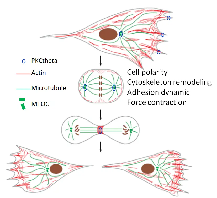 Le cancer est causé par la dérégulation des processus biologiques fondamentaux dans les cellules normales. Bien que les capacités de migration et de division cellulaires soient souvent progressivement augmentées au cours du développement et de la progression du cancer de type non invasif à hautement métastatique, le lien entre ces deux comportements cellulaires est rarement exploré. Ici, une question importante est de savoir si et comment ces deux comportements cellulaires sont intégrés par certains contrôles communs. En utilisant les cancers du sein et de l’ovaire hautement métastatiques comme modèle pour étudier l’agressivité tumorale, nous avons constaté que la sérine/thréonine kinase PKCtheta, une enzyme clé dans l’activation des lymphocytes T, est fortement exprimée dans ces sous-types de cancer particulièrement agressifs (Chadelle et al, Cancer Letters 2022). PKCtheta présente plusieurs localisations subcellulaires spécifiques dans ces cellules cancéreuses agressives impliquant diverses fonctions biologiques. En effet, PKCtheta est impliqué dans le contrôle de la prolifération, de la migration et de l’invasion des cellules cancéreuses agressives ainsi que de leur activité métastatique. Ici, notre objectif principal est de déterminer si et comment PKCtheta utilise des facteurs et des mécanismes communs tels que la polarité cellulaire, le remodelage du cytosquelette, la dynamique d’adhésion et la contraction des forces, pour gouverner et coordonner la migration et la division cellulaires. Ce comportement intégré amplifierait sans aucun doute l’impact de PKCtheta sur l’agressivité tumorale.