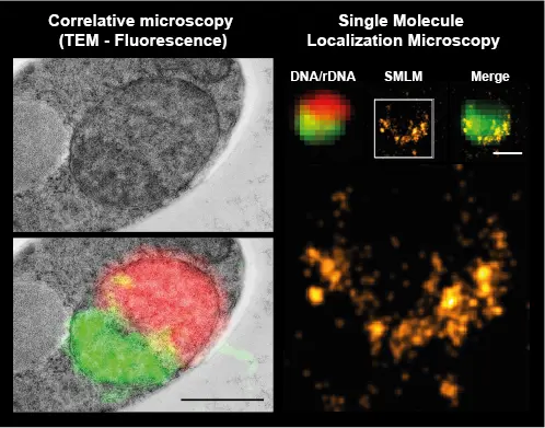 Pour aller plus loin, nous étudions la structure de la chromatine par des approches SMLM (Single Molecule Localization Microscopy), qui permettent théoriquement d’accéder à une plus haute résolution. Nous appliquons ces techniques en utilisant la levure S. cerevisiae comme modèle. En effet, son génome est plus petit et moins condensé que dans d’autres organismes plus complexes. Cependant, la densité des structures étudiées reste très élevée et constitue un défi pour la microscopie SMLM, qui nécessite à la fois l’utilisation d’un système d’imagerie très stable et une parfaite maîtrise des approches de traitement du signal inhérentes à cette technologie. Nous avons donc besoin d’un système SMLM performant, permettant des taux d’acquisition élevés tout en intégrant des approches de traitement du signal (flous variables, déconvolution dans la base de Zernike). Nous développons également une approche originale qui combine l’imagerie de l’ADN (DNA-PAINT) et la microscopie PALM des molécules partenaires de la chromatine. Pour cela, nous avons besoin d’un système d’imagerie qui nous permette de réaliser des acquisitions SMLM bicolores simultanées. Les ingénieurs de la plateforme ont déjà acquis une grande expertise dans les différents aspects de ce projet.