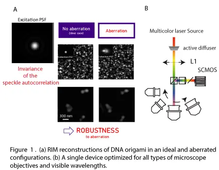 Dans ce projet, nous proposons d’étendre le principe de RIM dans les trois dimensions avec une analyse mathématique et un traitement des données appropriés, couplés à une instrumentation améliorée. Notre objectif est de fournir des images sur un grand champ de vue avec une résolution transverse de 100 nm et axiale de 200 nm et d’atteindre une cadence d’image de 10 à 30 Hz. 3D-RIM sera utilisé pour répondre à deux questions biologiques majeures pour lesquelles aucun microscope super-résolu actuel n’est opérationnel : l’interaction des cellules avec le tissu environnant pendant l’apoptose, qui nécessite de coupler une haute résolution spatiale à de grands champs de vue, et l’extrusion dynamique de la boucle de chromatine pendant la réparation de l’ADN, qui nécessite une haute résolution spatiotemporelle.
